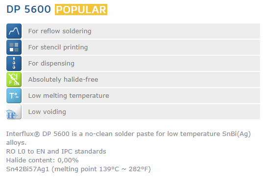 DP 5600 is a no-clean halide free solder paste for low melting point SnBi(Ag) alloys.