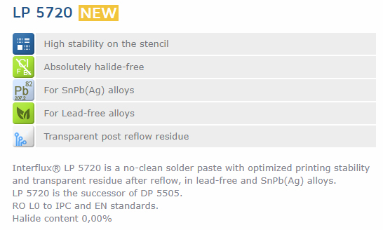 LP 5720 is a no-clean, absolutely halide free and lead-free solder paste developed for increased stability on the stencil and clear residues after reflow.