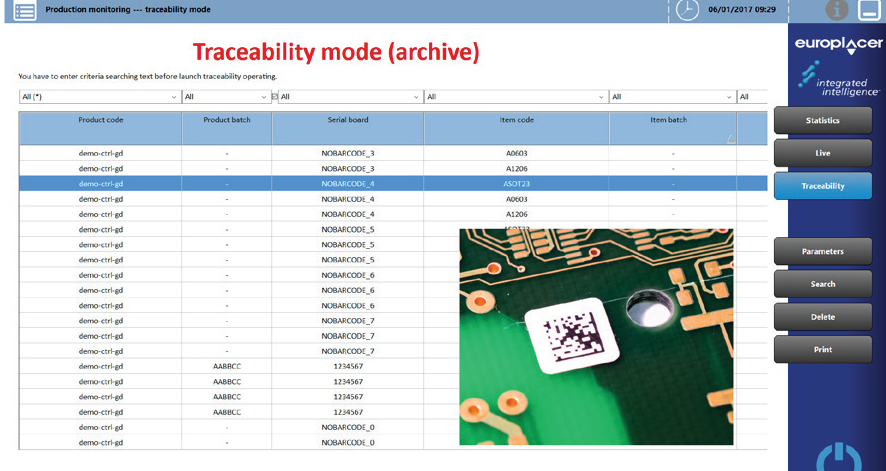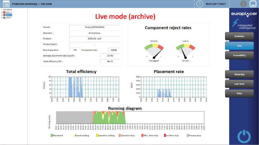 Serving as a production ‘dashboard’ for Europlacer machines, PROMON provides an easy-to-use single source of production management data. It continually collects and stores all production data from a machine, a single line, or multiple lines, with Live Mode allowing real-time viewing and local or remote analysis. Statistical Mode can analyse data over a specified period. With quantity data needed for management and reporting, and performance data instrumental in optimising productivity, PROMON is an ideal tool to analyse and search traceability data.