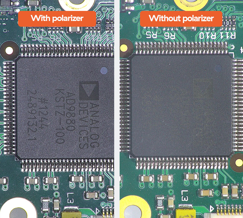 Calitatea excelentă a imaginii și fluxul live fluent al microscoapelor digitale TAGARNO fac ușoară verificarea poziționării corecte a componentelor în timpul producției. Cu aplicația Image comparison, puteți compara PCB-ul curent cu o imagine de referință (golden sample) pentru a detecta rapid abaterile.