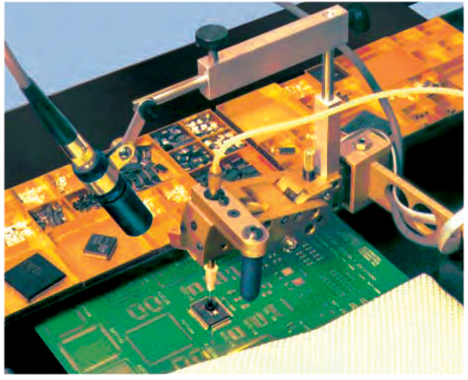 A machine-assisted manual system can be equipped with features such as an X-Y indexing table with vacuum pickup head or pen; ergonomic fixturing to help relieve operator fatigue; and additional fixturing for θ (rotation) and Z (height) positioning in addition to X and Y. Some machines offer an optional liquid solder paste dispenser, which is applied justbefore placing the component on the board if a stencil printer has not been used. Additional options include: